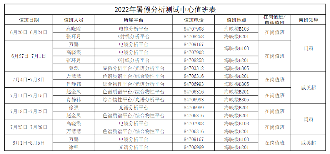 二、暑假期间,中心各分析平台教师轮流在岗值班,值班安排下图。
